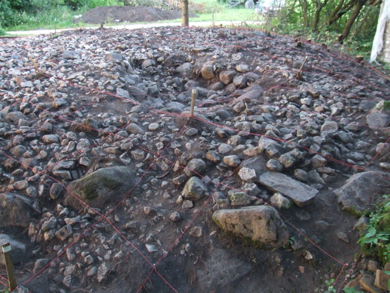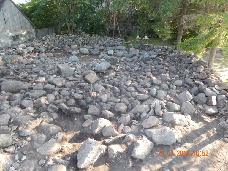 Vaade esimesele kihile Saunamäel, edelast. Kogu struktuur on kaetud ühtlase paekividest kihiga, samas kui suured vundamendikivid on servas juba näha. Lohk ei ole lõplikult välja puhastatud.