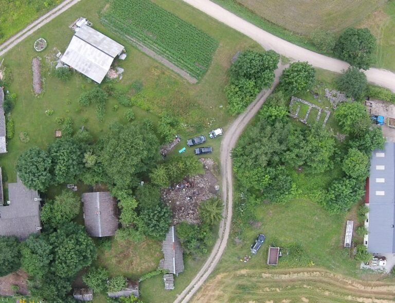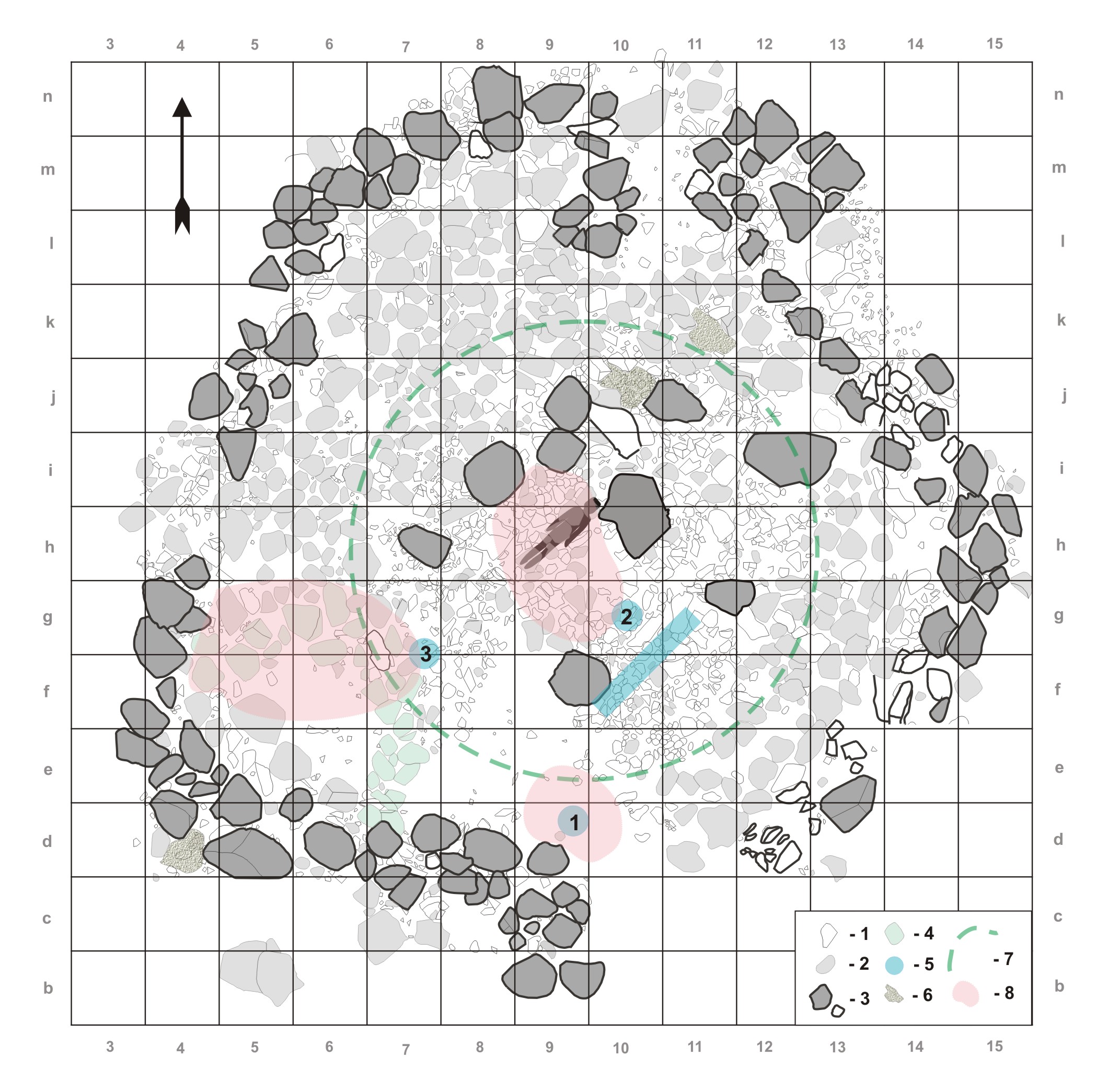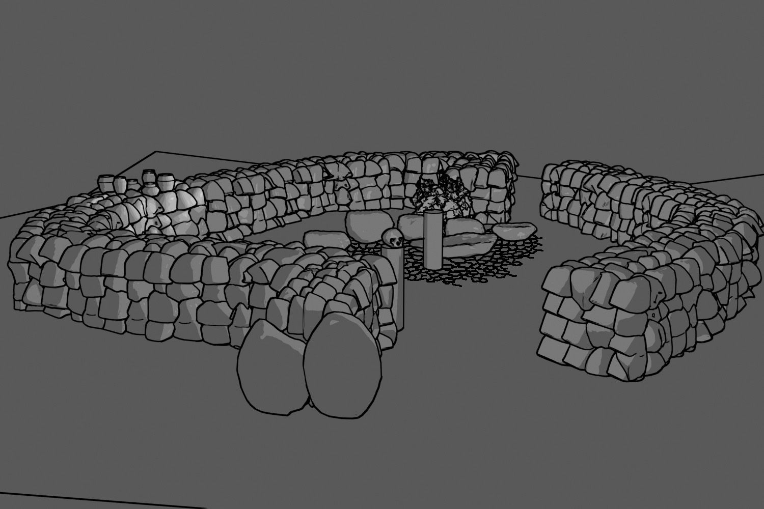 Kolmas kiht, loodest. Näha on ümbritseva kiviaia vundament, kiviaialt varisenud kivid ja keskne struktuur.