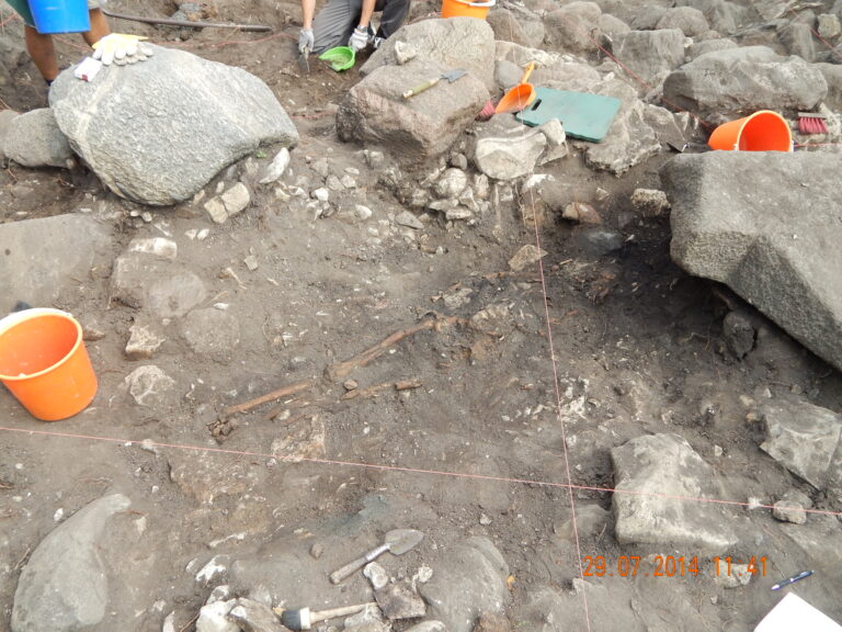 Just selle ala keskel, suurte kivide vahel ning veel ühe tõenäolise postikoha kõrval oli kolmas leidude kontsentratsiooniala. Ka siit saadi lisaks 6.-10. sajandi keraamikale ja loomaluudele mingil määral ka põletamata inimluid, mis dateerusid samasse aega, mis eelmise posti ümbrusest leitud kolju tükid. Samast võetud hobuse hammas andis aga dateeringuks meie ajaarvamise 5.-6. sajandi. Võib teha järelduse, et keskmisel rauaajal või viikingiajal oli siia mingite rituaalide käigus toodud kusagilt mujalt inimese luid.