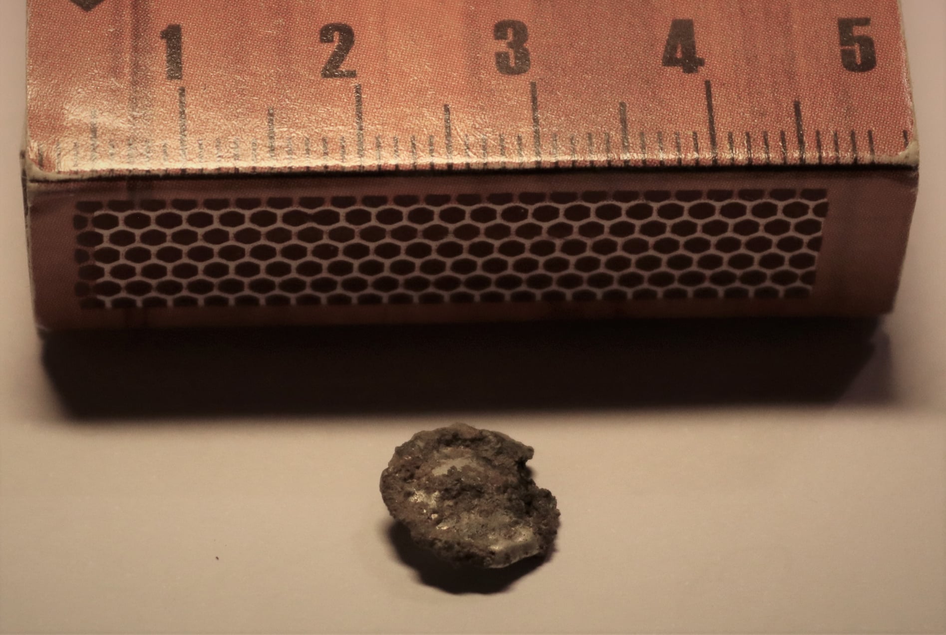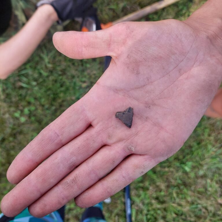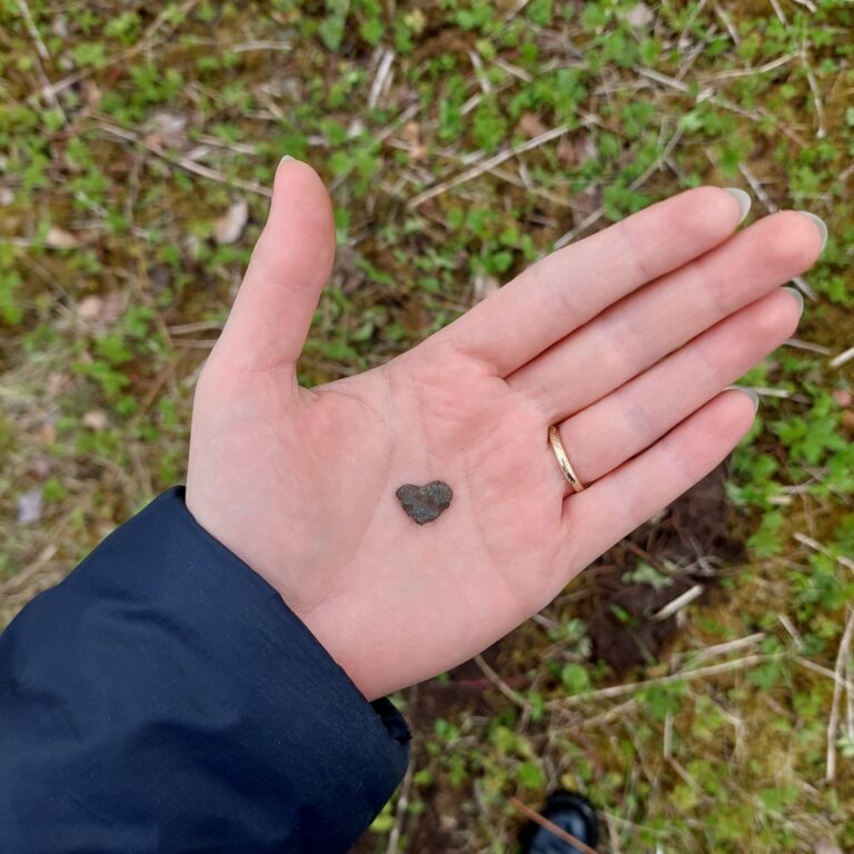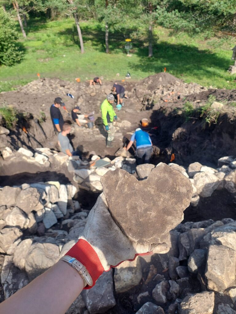 Südamekujuline keraamikakild, leitud Pöide linnuse õuelt 2024. aasta kaevamiste käigus.