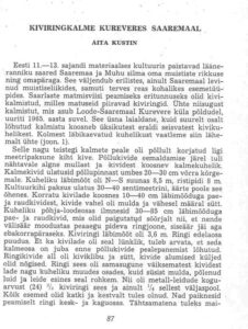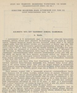 Metsar, L. (1950). Aruanne Kaarma valla Käku küla Kilgiaugu paemurru põhjakaldal asuva kivikalme kaevamisest 1.-29.VII. 1949. a. Tartus, 1. veebruaril 1950.