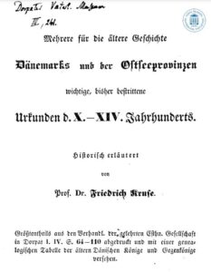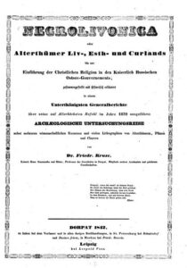 Kruse, F. (1842). Necrolivonica oder Alterthümer Liv-, Esth- und Curlands bis zur Einführung der Christlichen Religion in den Kaiserlich Russischen Ostsee-Gouvernements, zusammengestellt und historisch erläutert in einem Unterthänigsten Generalberichte über seine auf Allerhöchsten Befehl im Jahre 1839 ausgeführte archaeologische Untersuchungsreise nebst mehreren wissenschaftlichen Excursen und vielen Lithographien von Alterthümern, Plänen und Charten. Dorpat: F. Kruse, H. Laakmann [etc]; Leipzig: L. Voss.